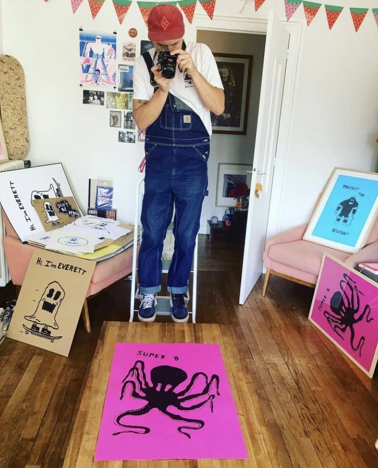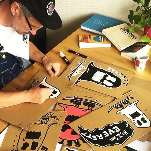 Ainsi apparaît Everett. Premier né d’une bande d’outsiders crayonnés, Everett est un petit fantôme tout droit sorti du folk art, chaîne à la ceinture plutôt qu’aux pieds et grippé sur un skateboard, que l’on retrouve sur les tee-shirts et hoodies de sa marque DIY Team Pepperoni Skateboards.